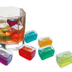 Die Freez it! Eiswürfel sind aus Glas und mit Lebensmittelfarbe gefüllt. Dadurch kann ihr Getränk nicht verwässern, wird aber trotzdem gekühlt.