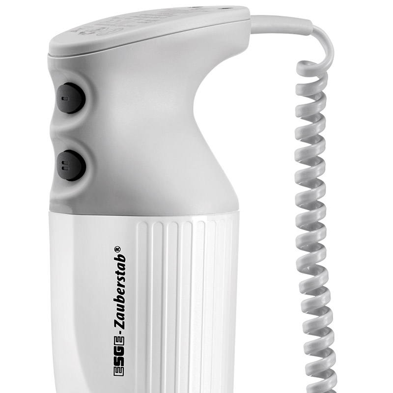 Mit dem ESGE-Zauberstab® M 350 Maître kommt ein leistungsstarkes Kraftpaket in die Profi-Küche, denn der langlebige, robuste AC-Motor sorgt mit 350 Watt dafür, dass per Sicherheits-Twinschalter wahlweise mit 18.000 oder 22.000 Umdrehungen pro Minute gearbeitet werden kann. Behälter mit bis zu 20 Liter Flüssigkeit können mühelos eingesetzt werden, denn die längere Antriebswelle ist für eine Eintauchmenge bis circa 29 Zentimeter ausgelegt. Bewegungsfreiheit gewährleistet das Spiralkabel, denn es ist bis zu einer Länge von 150 Zentimetern ausziehbar.