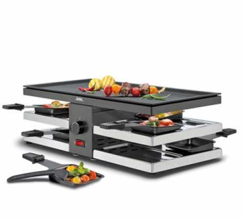 Das Raclette von Spring ist mit drei verschieden Ebenen ausgestattet, zwei für die 8 vorhandenen Pfännchen und eine abnehmbare, antihaftbeschichtete Grill-Platte aus Aluminium, um beispielsweise Gemüse anzubraten. Die Temperatur des Raclettes lässt sich stufenlos regulieren und die leistungsstarke Heizspirale bringt den Käse schnell zum Schmelzen. Möchten Sie währrend des Essens eine kleine Pause einlegen, können Sie Ihr Pfännchen bequem auf der dafür vorgesehenen Ablage ablegen. Das aus hochwertigem Edelstahl gefertigte Gerät ist von allen Seiten bedienbar und die einzelnen Ebenen können zur einfacheren Reinigung entfernt werden. Die beiden mittleren Ebenen sind sogar Spühlmaschinenfest