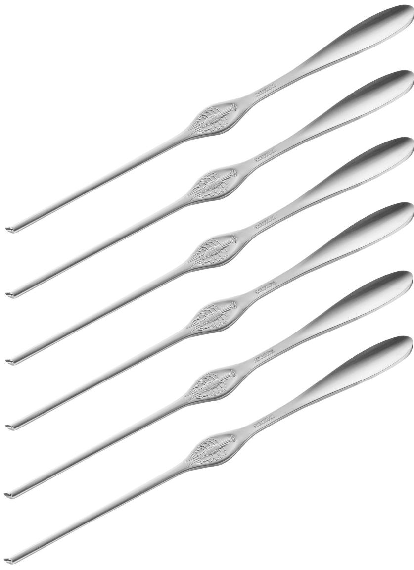 Die Hummergabeln von Carl Mertens sind aus Edelstahl gefertigt und besitzen eine schlanke Form sowie abgewinkelte Zähne, um auch den letzten Happen aus jeder Hummerschale zu lösen.