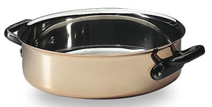 Das Sautoir, also eine Schwenkpfanne mit zwei Griffen, hohem Rand und Deckel, besteht zu 90% aus massivem Kupfer und zu 10% aus einem Innenlayer aus dünnem Edelstahl. Die innere Stahlschicht macht den Topf unverwüstlich, die 90% Kupferschicht erlaubt eine vorzügliche Wärmeregulierung. Die Griffe aus Gußeisen erwärmen sich nicht so schnell wie vergleichbare Messinggriffe.