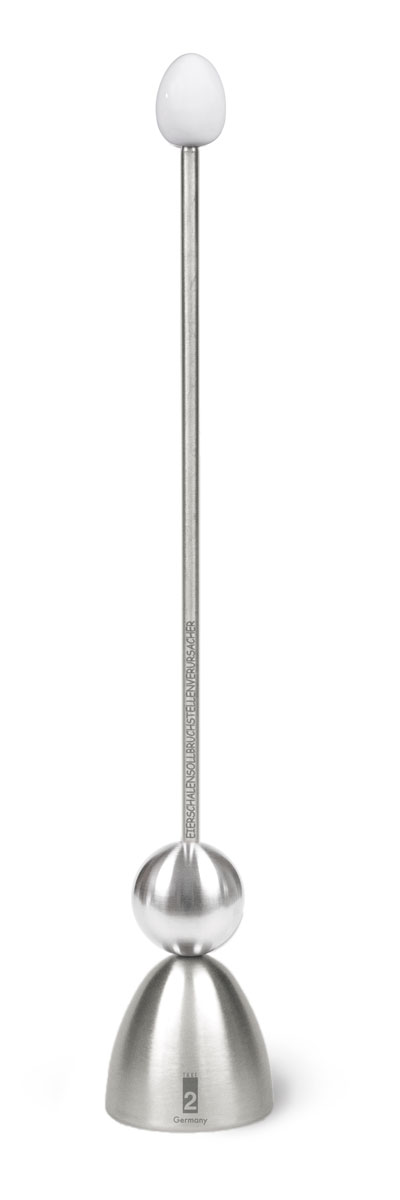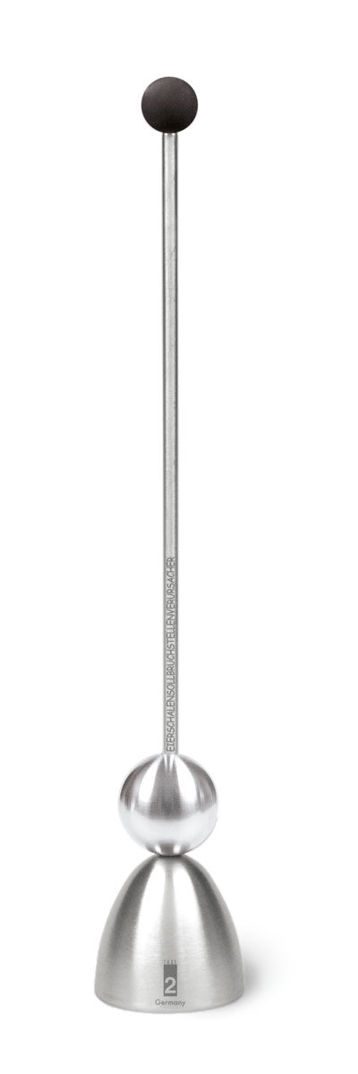Der sogenannte Eierschalensollbruchstellenverursacher packt mit einer einzigartigen Technik jedes Ei beim Kragen. Man setzt die Metallkappe auf das gekochte beziehungsweise ungekochte Ei, lässt die Schlagkugel am Führungsstab frei fallen und eine ringförmige Bruchstelle entsteht. An dieser lässt sich die Ei-Kappe mit einem Messer leicht abheben.