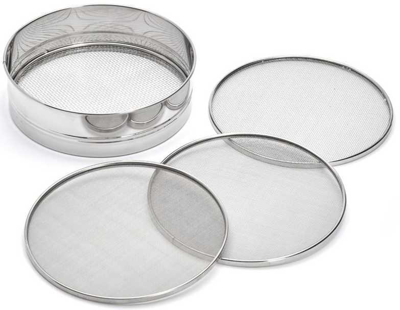 Das Sieb ist vielseitig einsetzbar und eignet sich sowohl für herkömmliches Mehl als auch für Mandel- und Kokosnussmehl sowie Kakao. Es enthält vier auswechselbare Einsätze mit unterschiedlichen Maschengrößen, die einen Durchmesser von 3 mm, 2 mm, 1 mm und 0,5 mm haben. Dadurch haben Sie die Möglichkeit, je nach Bedarf die gewünschte Feinheit zu wählen und Ihre Zutaten präzise zu sieben.