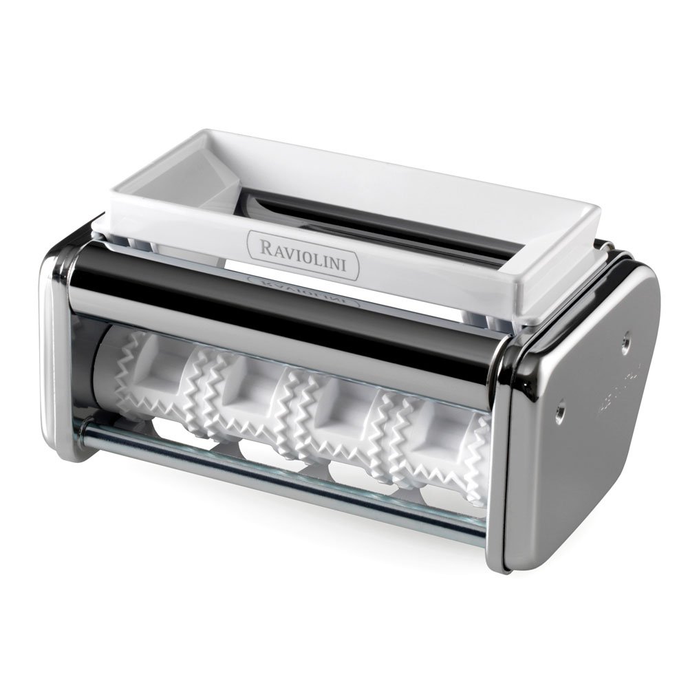 Nachdem Auswalzen des Teigs, wird der Teig in der Mitte der Teigbahn in den Raviolivorsatz gelegt und die Füllung eingefüllt. Dann dreht man mit der Kurbel (o. per Motor) einige Umdrehungen und die gefüllten Teigtaschen fallen kochfertig aus dem Gerät.