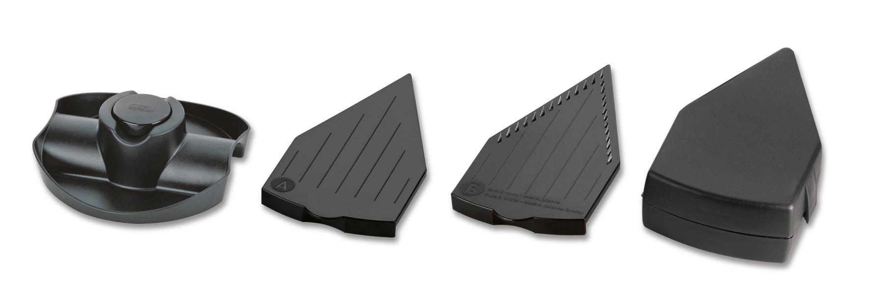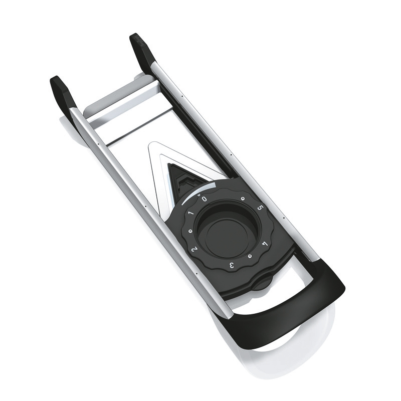 • der Gourmet-Hobel mit integriertem Stellrad für unterschiedliche Schnittstärken.