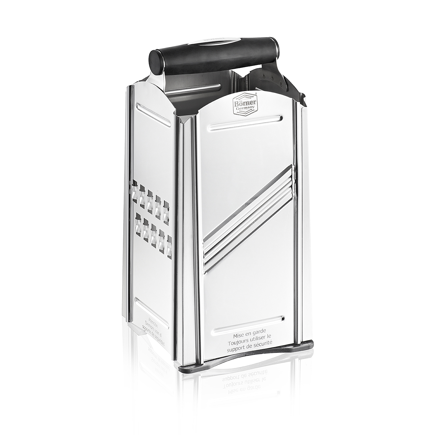 Der Combi-Chef Vierkant-Gemüsehobel beinhaltet einen Scheiben-, Rösti-, Rohkostschneider und eine Gemüsehobel. Er beinhaltet einen Fruchthalter und eine Auffangschale.