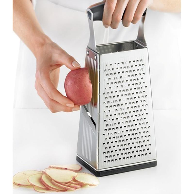 Beim Reiben von Lebensmitteln ist Sorgfalt gefragt. Achten Sie darauf, Ihre Finger rechtzeitig vom Rand der Reibe wegzubewegen, wenn das Schneidegut kleiner wird. Arbeiten Sie in gleichmäßigen Bewegungen und üben Sie nicht zu viel Druck aus, um Verletzungen zu vermeiden. Reinigen Sie die Reibe nach dem Gebrauch gründlich, aber vorsichtig, da die Kanten scharf sein können. Lagern Sie sie an einem sicheren Ort, um Unfälle zu vermeiden.