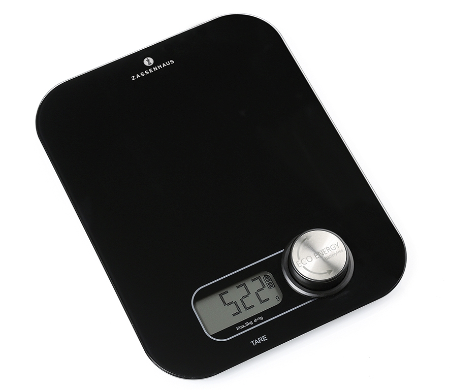 Erst drehen, dann Gewicht sehen. Die Zassenhaus Digitalwaage Eco Energy hat einen eingebauten Dynamo. Durch Betätigen des Drehknopfes wird Bewegung in elektrische Energie umgewandelt – ein Prinzip, das sich beim Fahrrad oder Generator schon seit langem bewährt hat. Der Vorteil hier: Die umweltschonende Waage kommt ohne Batterien aus und ist stets einsatzbereit. Notkäufe im Supermarkt, weil Sie kurz vor dem Backen feststellen, dass die Batterie leer ist, gehören der Vergangenheit an. Die hochwertige Wiegefläche aus Glas fasst Lebensmittel bis fünf Kilogramm, das Gewicht wird in Einheiten von einem Gramm angezeigt. Zur innovativen Funktionsweise und modernen Optik der Waage passt die zeitgemäße Ausstattung mit Sensor-Touch-Bedienfeld und Abschaltautomatik. Und wenn Sie jetzt noch mehr für Ihre Öko-Bilanz tun möchten, erledigen Sie den nächsten Einkauf mit dem Fahrrad.
