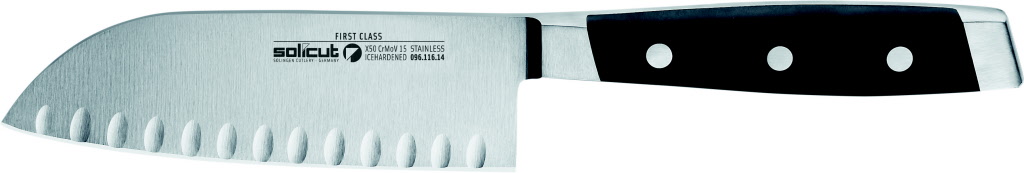 Der Santoku mit traditionelle Kullenschliff der Serie FIRST CLASS, mit einer Klingenlänge von 18cm, ist ideal zum schneiden von hauchdünnen Scheiben. Die runde Warte macht Kräuterhacken kinderleicht. Besonders gut eignet sich dieses Messer zum Vorbereiten von Lachs, Schinken oder Gemüse.