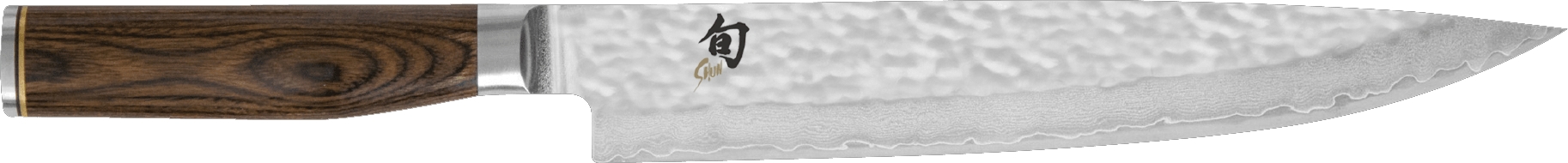 Hart, elastisch, präzise – die Klinge mit VG Max Stahl und 32 Lagen Damaszenerstahl. Beidseitig geschliffen, leicht, perfekter Schnitt. Tsuchime-Hammerschlagoberfläche für müheloses Lösen. Symmetrischer Griff für Links- und Rechtshänder, durchgehender Erl für Stabilität. Griffende mit Tim Mälzer Bullenkopf. Shun Premier von KAI – Präzision, Ästhetik, Perfektion!