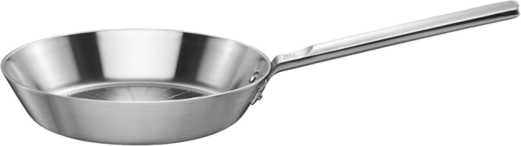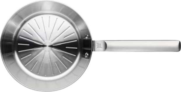 Die Norden Stahl-Bratpfanne 28 cm, unbeschichtet, hat einen dicken Boden und ein mehrlagiges Design, das von Rand zu Rand reicht und ein gleichmäßiges Erhitzen des Kochgeschirrs ermöglicht, ideal zum Braten und Anbraten bei hohen Temperaturen. Der Aluminiumkern zwischen der äußeren und der inneren Edelstahlschicht garantiert eine gleichmäßige und effiziente Erwärmung auf allen Herdarten. Ein eingraviertes Muster im Boden der Pfanne sorgt für eine gleichmäßige Verteilung von Öl oder Butter beim Kochen. Der markante Edelstahlgriff minimiert die Wärmeübertragung und erleichtert die Verwendung. Maximale Brat- und Backtemperatur 270 °C. Hergestellt in Finnland.