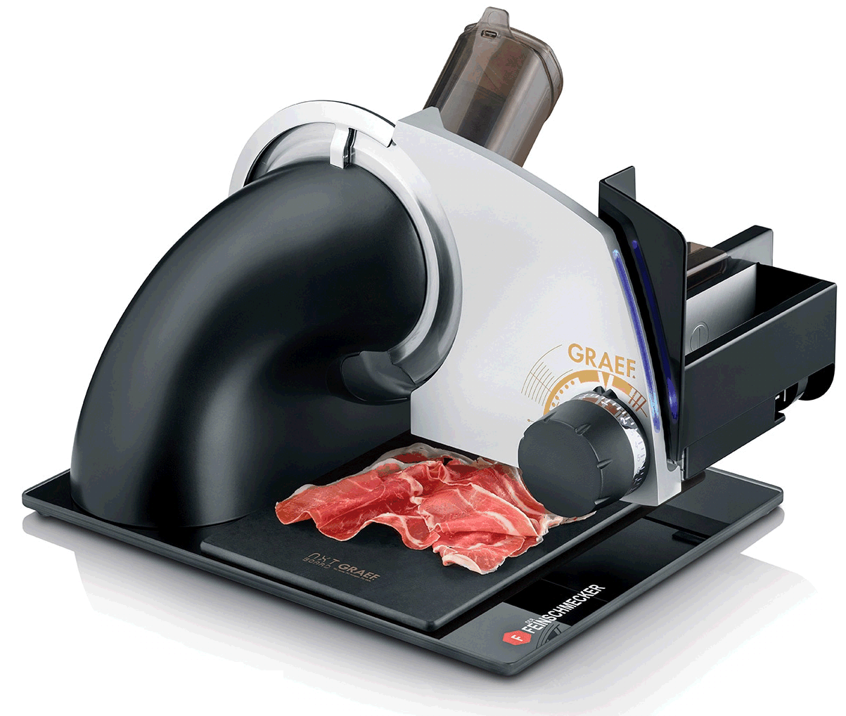 Der Allesschneider SKS700 von GRAEF ist ein wahres Meisterstück in der Küche. Mit seinem einzigartigen Beleuchtungskonzept sorgt er für Durchblick und Sicherheit beim Schneiden von Zutaten. Die integrierte LED-Safety-Control zeigt an, ob das Messer noch geöffnet ist und erinnert daran, es zu schließen. Dank der Feineinstellung im Schnittstärkenbereich von 0-2 mm ermöglicht das flüsterleise Edelstahlmesser millimetergenaue Schnittergebnisse. Das kühle Vollmetallgehäuse, abgerundete Formen und bruchsicheres Glas machen den Allesschneider zu einem echten Hingucker auf der Küchentheke. Mit seinem Stand-by-Modus, der nach fünf Minuten die Beleuchtung ausschaltet, und der einfachen Reinigungsmöglichkeit bietet der SKS700 auch Komfort und Zeitersparnis. Zusätzliches Zubehör wie der MiniSlice-Aufsatz, Messerschärfer, Messerabnahmevorrichtung und Edelstahltablett machen ihn zu einem vielseitigen Begleiter in der Küche.
