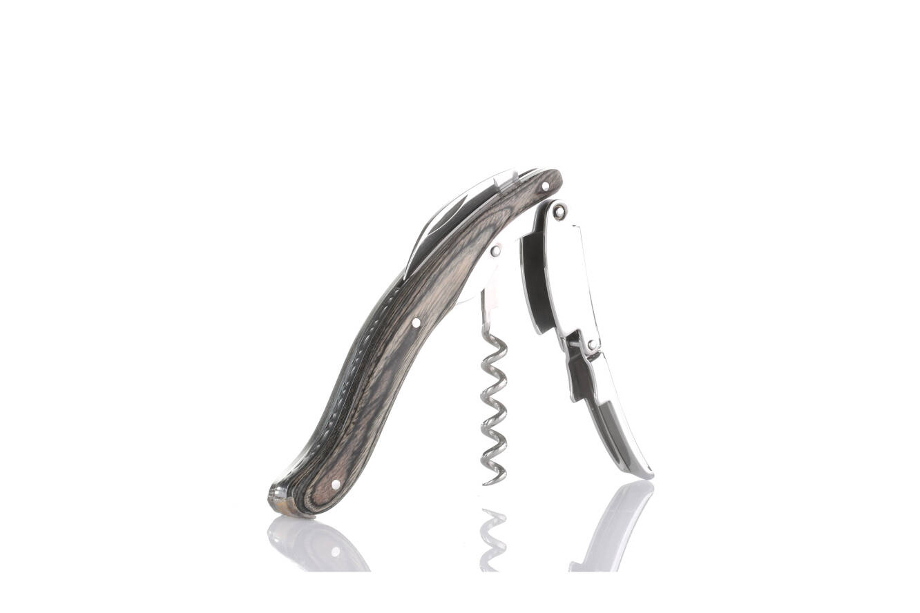Der ergonomische graue Stamina-Holzgriff liegt angenehm in der Hand und bietet eine glatte, hochwertige Haptik. Dank des zusätzlichen Doppelgelenk-Hebels lassen sich selbst lange Korken mühelos entfernen. Die kunstvoll gravierten Details verleihen dem Korkenzieher eine exklusive Optik.