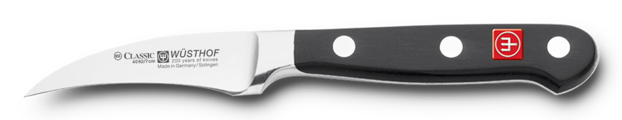 - Dieses kleine, handliche Messer mit seiner kurzen säbelförmig gebogenen Klinge wird auch Schälmesser genannt und eignet sich besonders gut zum Schälen und Putzen von rundem Gemüse und Obst.
