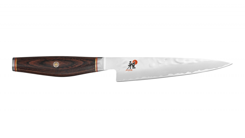 Das Messer stammt aus der Serie MIYABI 6000MCT und hat eine Klinge im Hammerschlag-Design, auch Tsuchime-Look. Der Griff ist aus hochwertigem Cocobolo-Pakka-Holz und weist eine sanfte Maserung auf. Als besonderes Designelement dient ein Mosaikpin. Der Griff besitzt formstabile und pflegeleichte Eigenschaften. Für ein ermüdungsfreies Schneiden sorgt die ausgewogene Balance des Messers, welche eine angenehme Arbeit sichert.